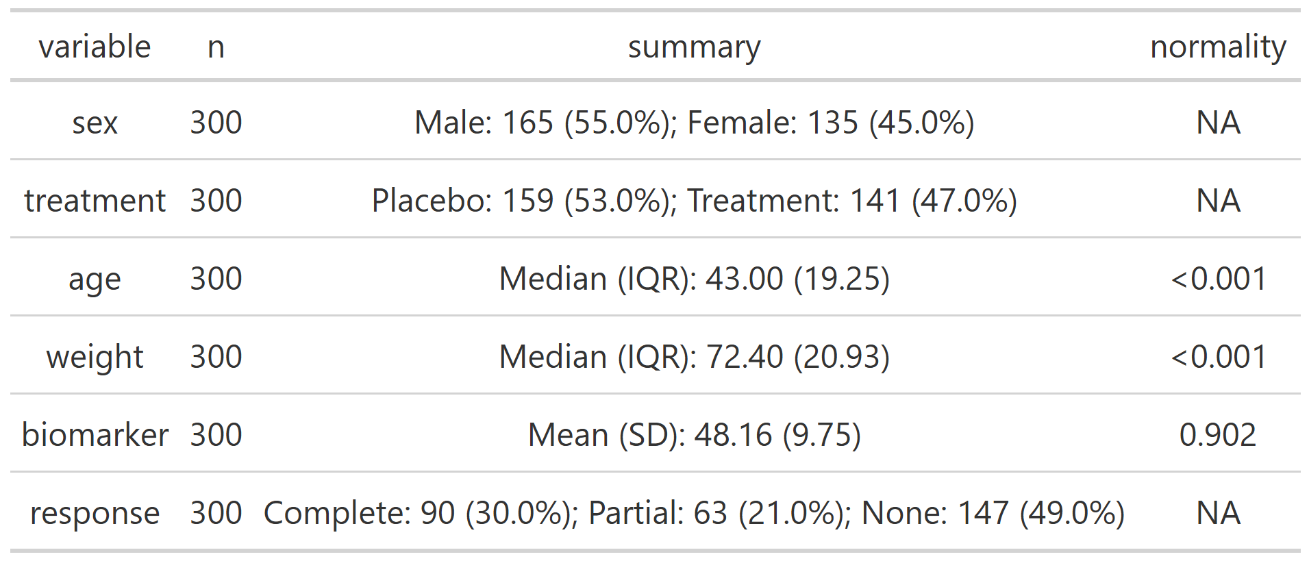 summary_table(clinical_df, group_by = 'treatment', exclude = c('subject_id', 'visit'))