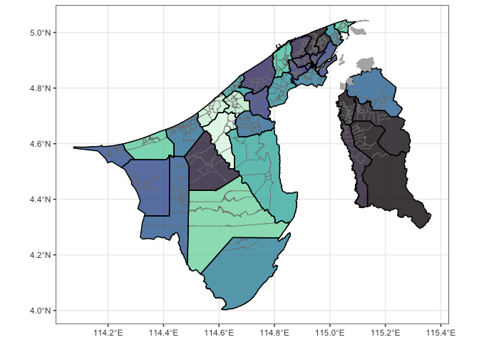 Provides Brunei GIS data in the form of a sf (simple features) object ready for plotting and analysis in R. The smallest (areal) unit of analysis is a “kampong” (although not all areas are actual kampongs), which in turn is contained within mukims and districts.