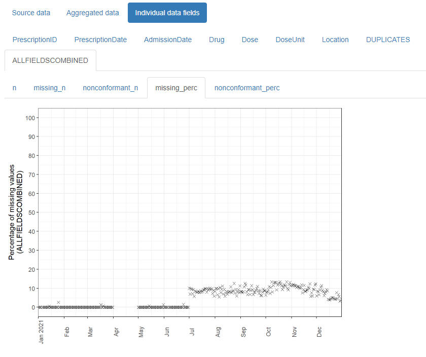The daiquiri package generates data quality reports that enable quick visual review of temporal shifts in record-level data. Time series plots showing aggregated values are automatically created for each data field (column) depending on its contents (e.g. min/max/mean values for numeric data, no. of distinct values for categorical data), as well as overviews for missing values, non-conformant values, and duplicated rows.