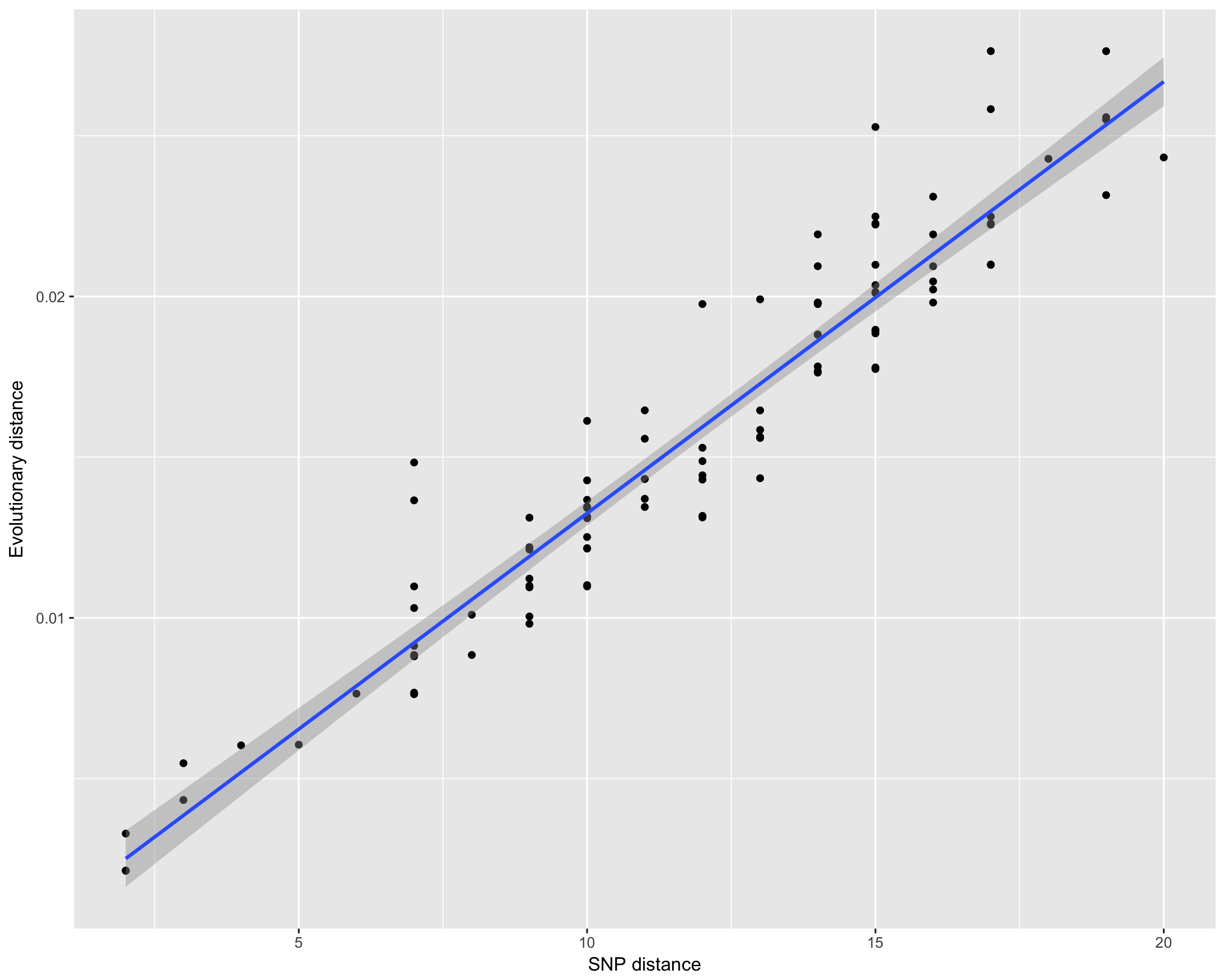 dist_df ggplot(dist_df, aes(x = dist, y = evol_dist)) +