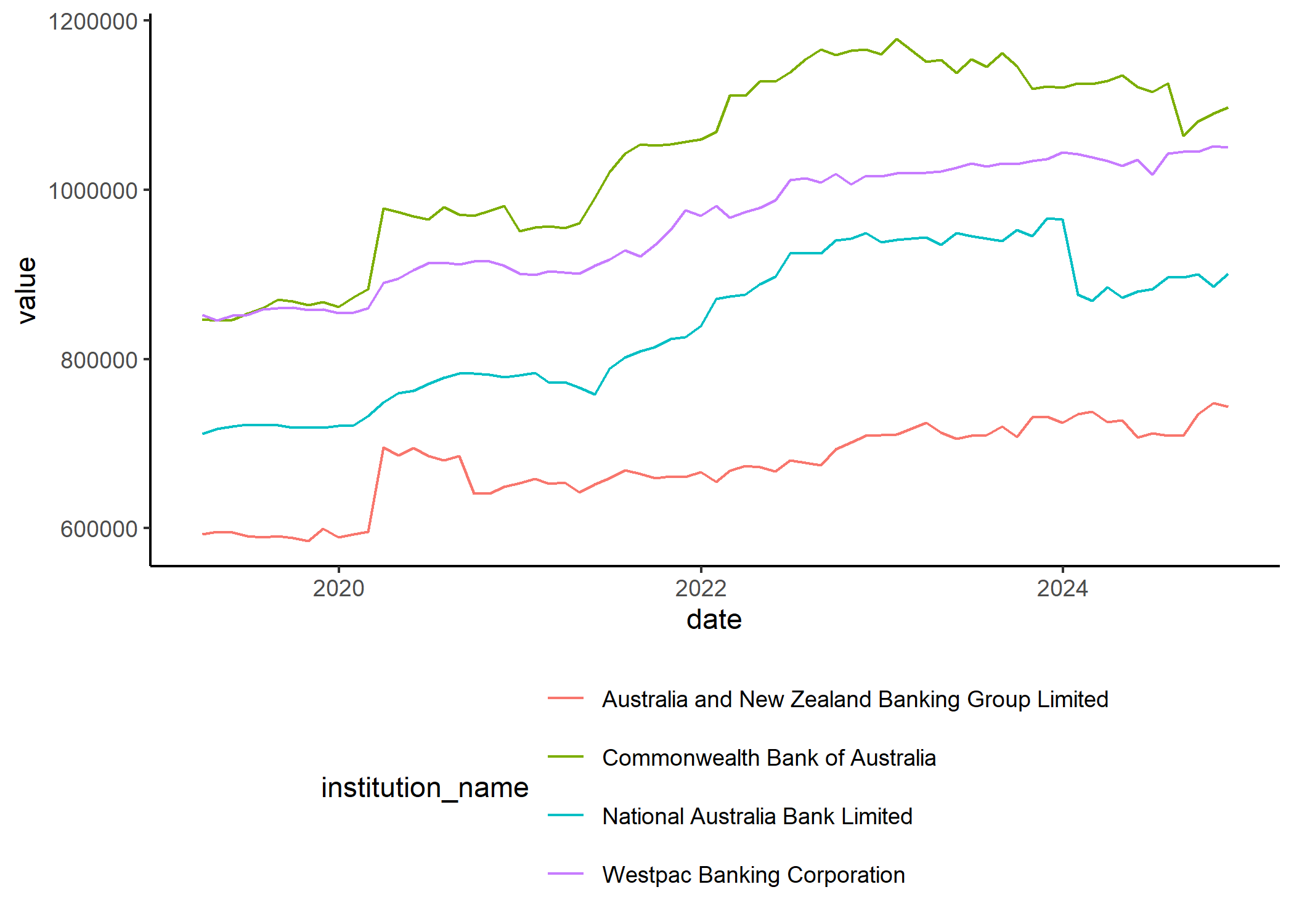 The following example demonstrates the plotting of total resident assets on a monthly basis for Australia’s four major banks.